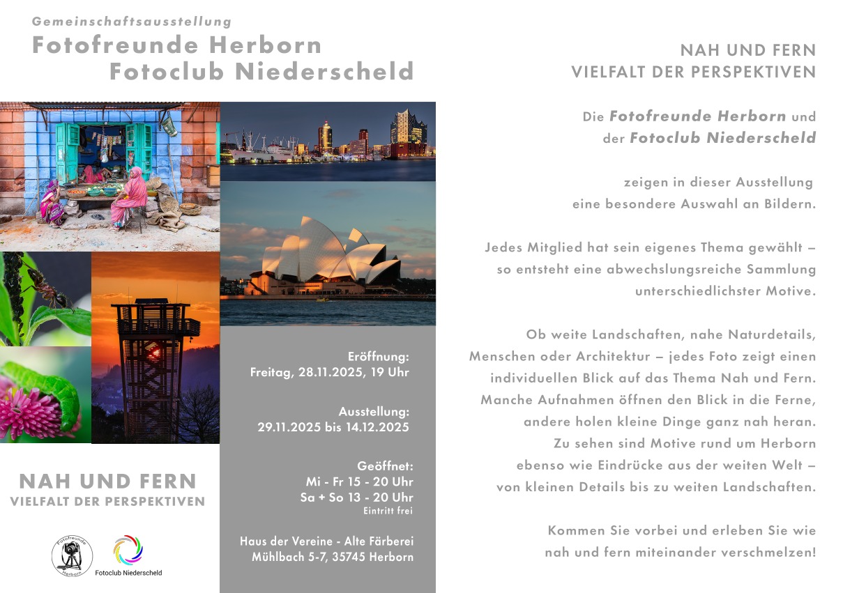 Die Fotofreunde Herborn und der Fotoclub Niederscheld zeigen in einer gemeinsamen Ausstellung eine Auswahl fotografischer Arbeiten zum Thema „Nah und Fern“. Am Freitag 28. November 2025 wird die Ausstellung um 19 Uhr im Haus der Vereine (Alte Färberei), Mühlgasse 5-7 eröffnet