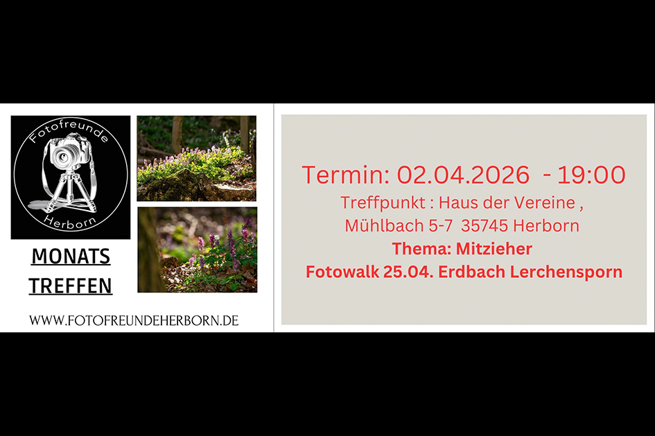 Im Anschluss habt ihr bis zum nächsten Stammtisch Zeit, euch selbst daran auszuprobieren. Eure Ergebnisse schauen wir uns dann gemeinsam beim Mai-Treffen an – natürlich zusammen mit euren Bildern vom Fotowalk zum Lerchensporn. 📸